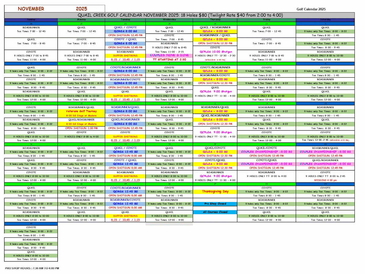 November Golf Calendar