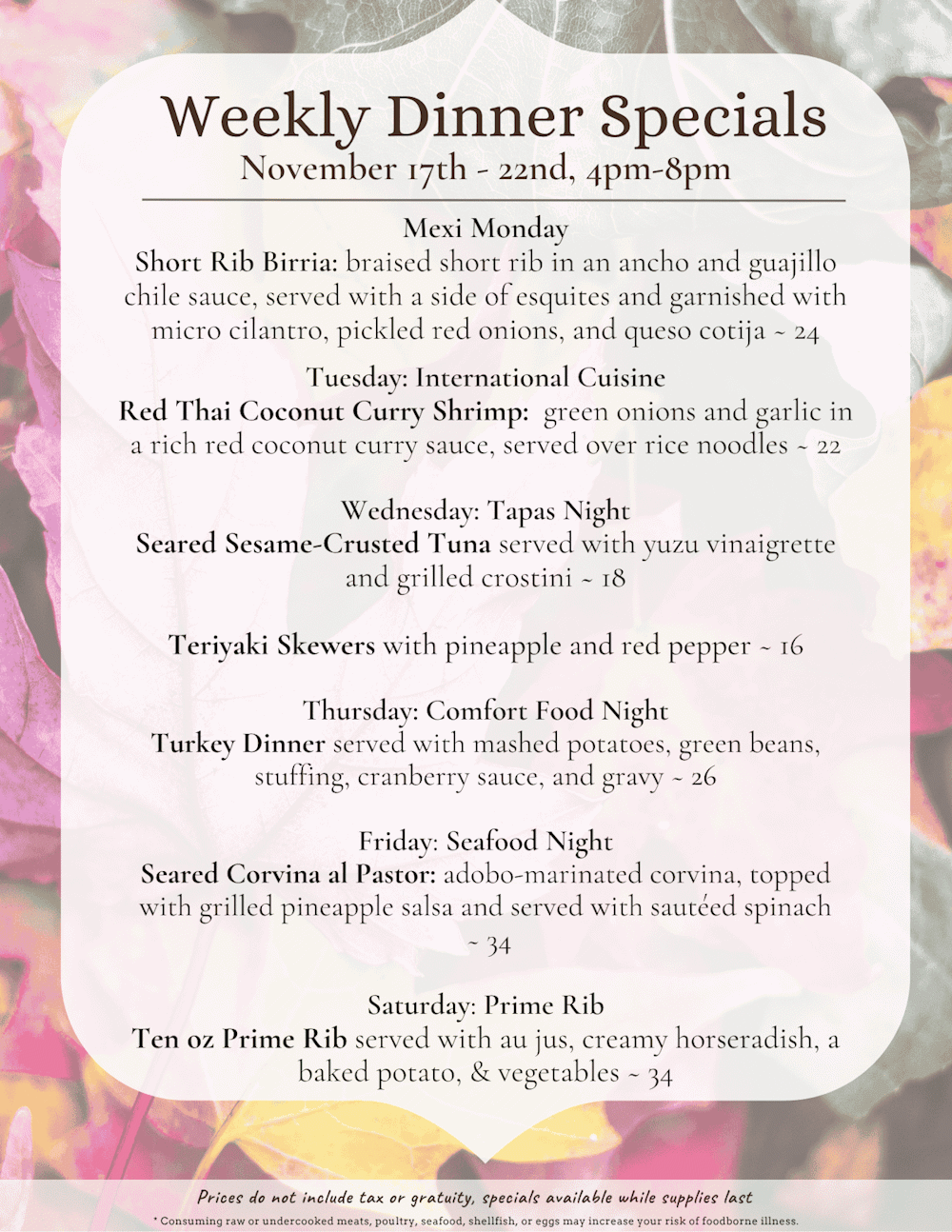 Dinner Specials - 11/17 to 11/22