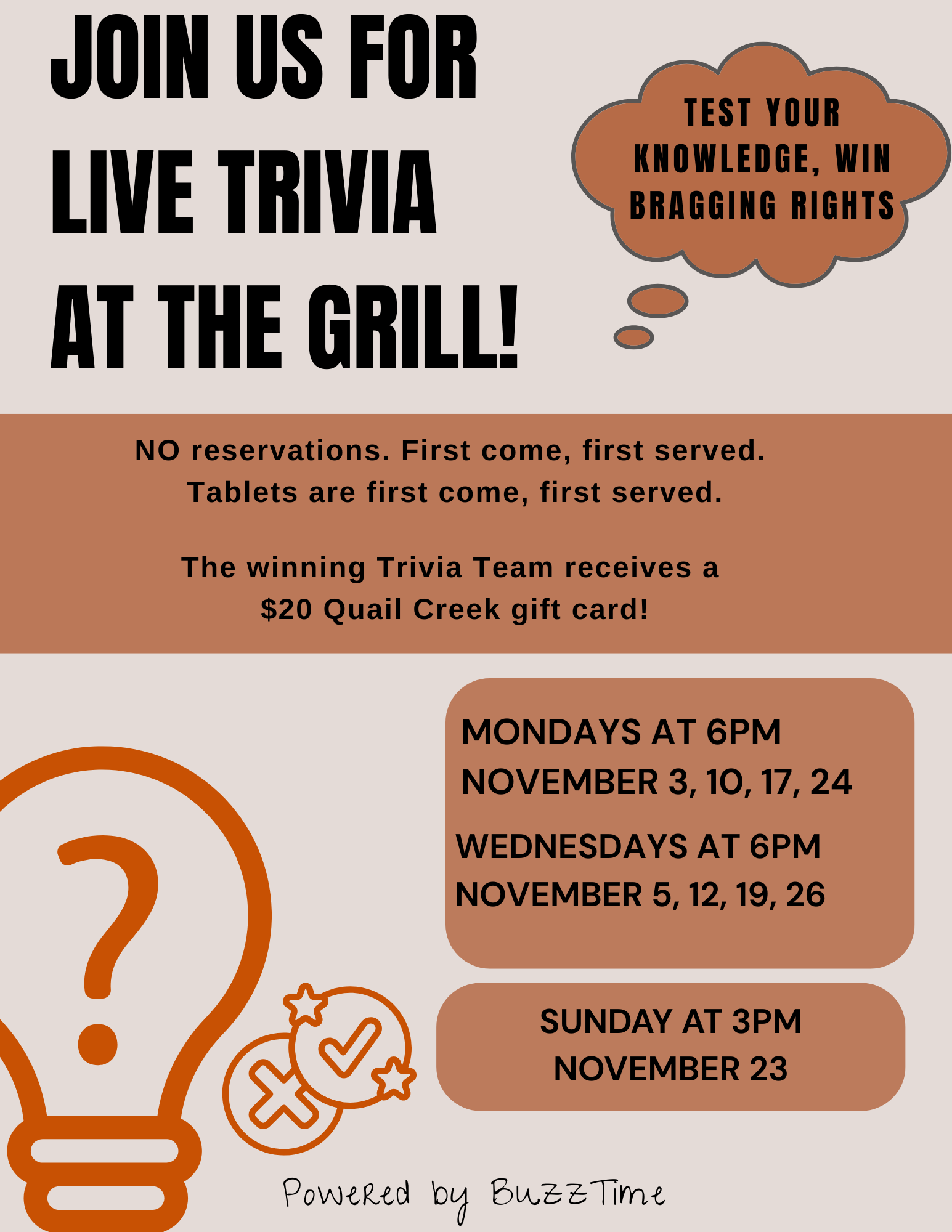 The Grill at Quail Creek is truly a delightful centerpiece, a gathering place where neighbors come to catch up on conversation or plan that next big adventure. You’ll enjoy the indoor & outdoor dining areas, board room with fireplace for private parties, and a U-shaped bar for enjoying happy hours with friends.
